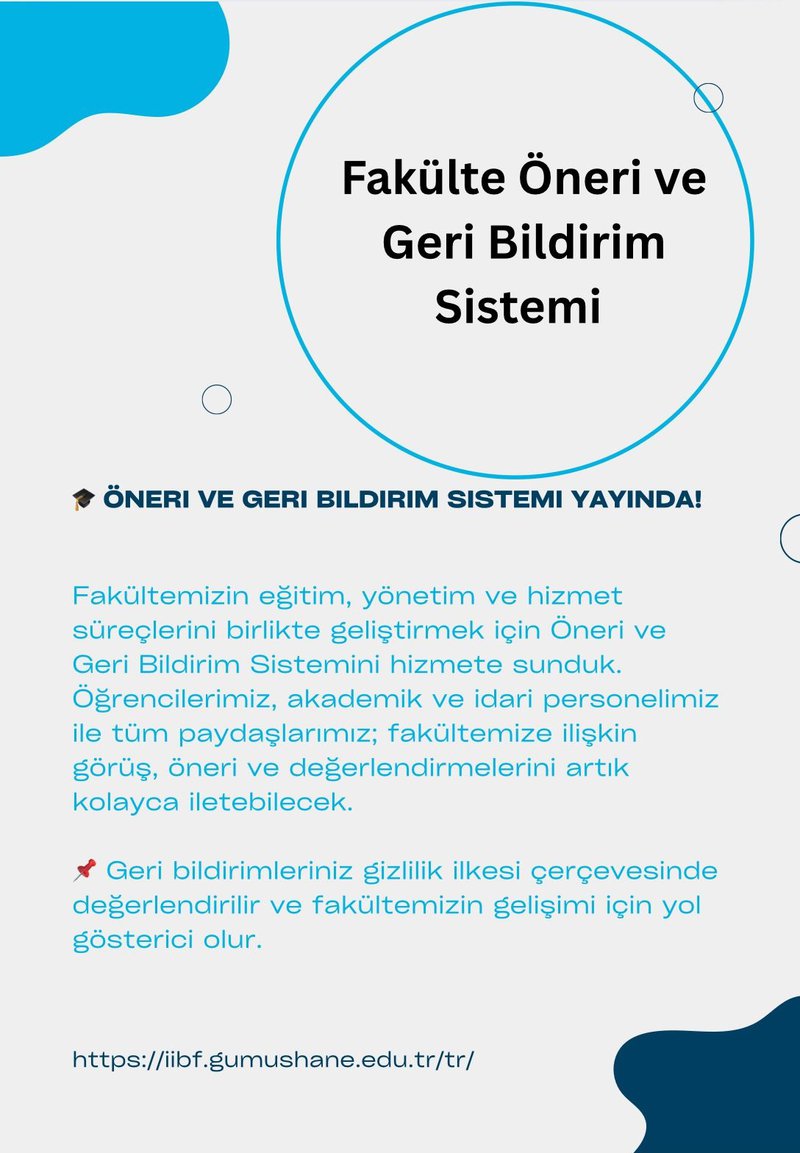 Fakültemizin eğitim, yönetim ve hizmet süreçlerini birlikte geliştirmek için Öneri ve Geri Bildirim Sistemini hizmete sunduk. Öğrencilerimiz, akademik ve idari personelimiz ile tüm paydaşlarımız; fakültemize ilişkin görüş, öneri ve değerlendirmelerini artık kolayca iletebilecek.