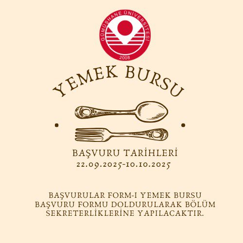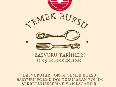 Başvurular Gümüşhane Üniversitesi Yemek Bursu Yönergesinin 7’nci maddesi kapsamında değerlendirilerek Asil ve Yedek olarak sıralanacaktır. Başvurular 22.09.2025-10.10.2025 tarihleri arasında Bölüm Sekreterliklerine yapılacaktır.